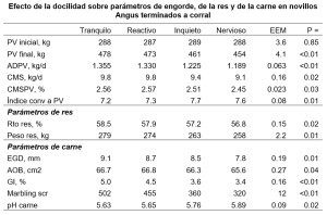 La ganancia de peso diaria (ADPV) fue mayor en los animales más dóciles (grupos Tranquilo y Reactivo) con hasta 116 g de diferencia respecto del Nervioso. Los dos más mansos tuvieron además mejor índice de conversión que los Inquieto y Nervioso (7.2 y 7.3 versus 7.7 y 7.6).