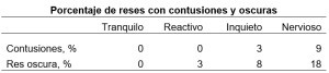 Adicionalmente, las reses de los animales más estresados mostraron contusiones, siendo muy significativa su proporción en el tratamiento Nervioso (9%). De igual manera, la proporción de reses oscuras creció con la reactividad y el estrés llegando a una proporción muy alta en Nervioso (18%). En concreto, no solo se desaprovecha cantidad sino calidad.