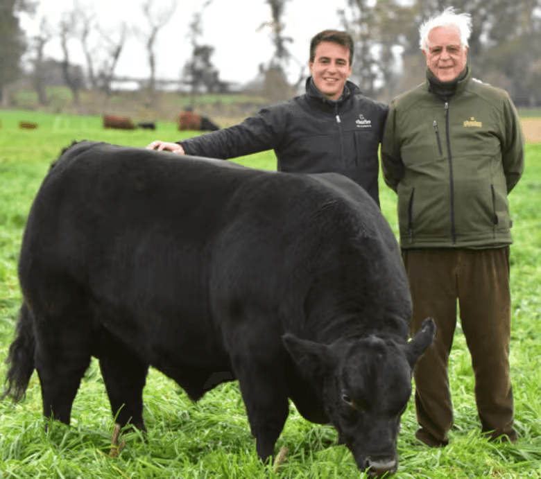 Carlos Pestalardo y su abuelo Carlos, junto a un reproductor Angus en el campo.
