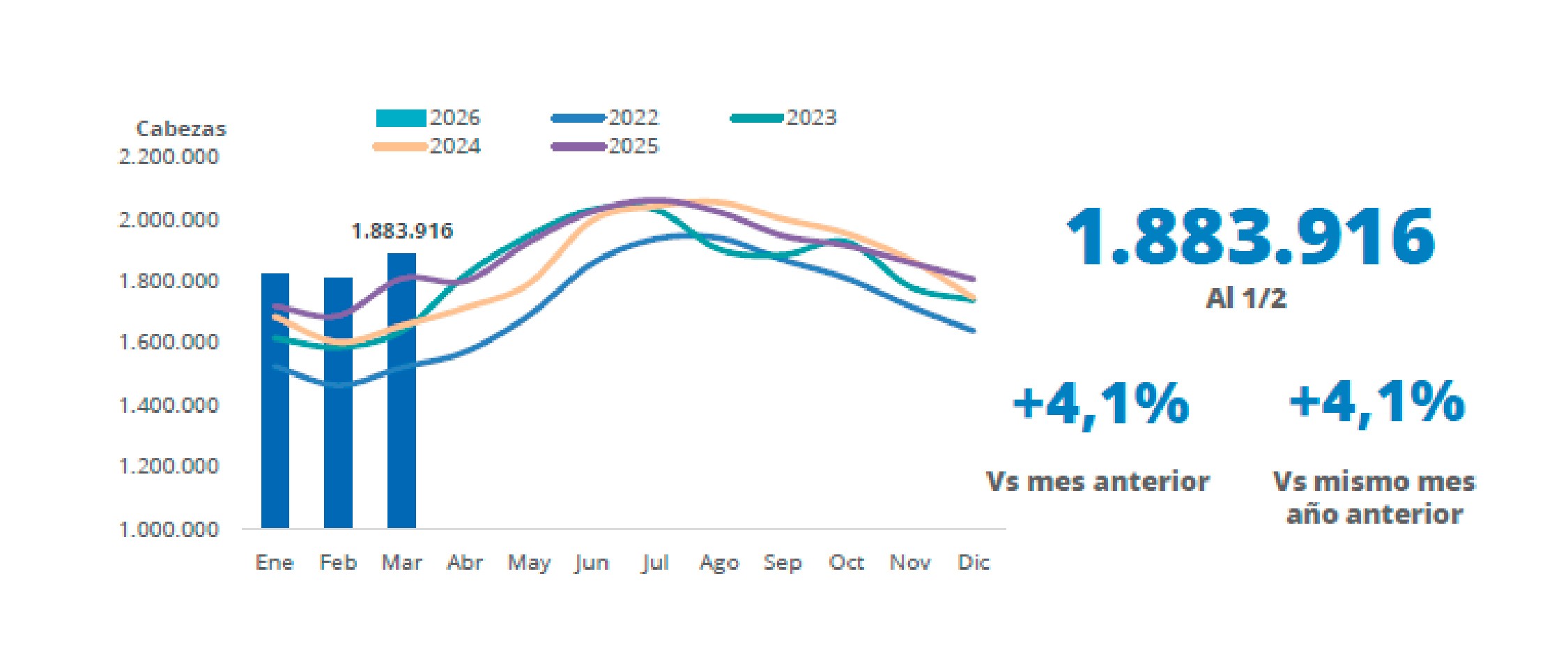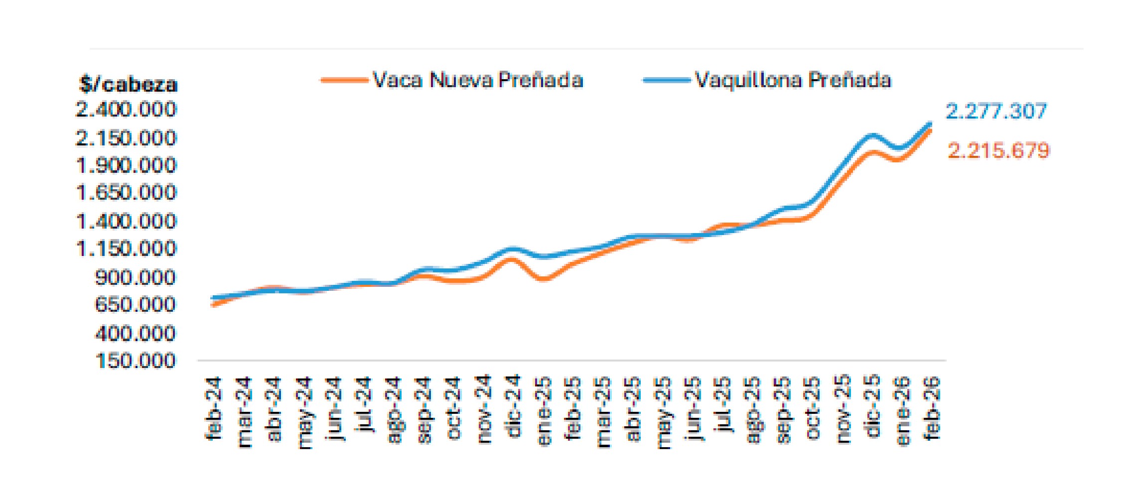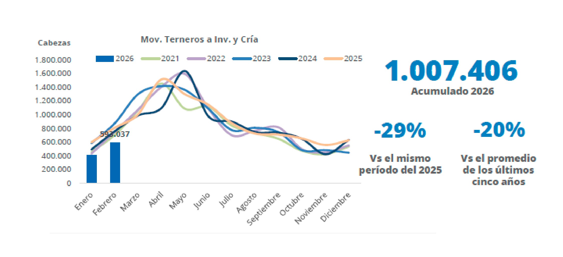 La oferta estacional continúa siendo limitada, en los primeros 2 meses del año el movimiento de terneros/as desde campos de cría fue un 29% inferior al año pasado. El ternero de 170kg. llegó a superar los $7.000/kg, pero a principio de marzo los compradores presionaron hacia la baja. El ternero de destete llega a la zafra un precio 90% por encima de la zafra 2025. Por su parte, las vaquillonas con garantía de preñez generales alcanzaron valores máximos próximos a$2.600.000. Crece la intención de retención de terneras por parte de los productores, podríamos estar ingresando a un ciclo de retención. La escasez de precipitaciones en algunas regiones adelantó la zafra y generó un mayor volumen de oferta; sin embargo, no se observaron bajas significativas en los precios, lo que evidencia la solidez estructural del mercado.