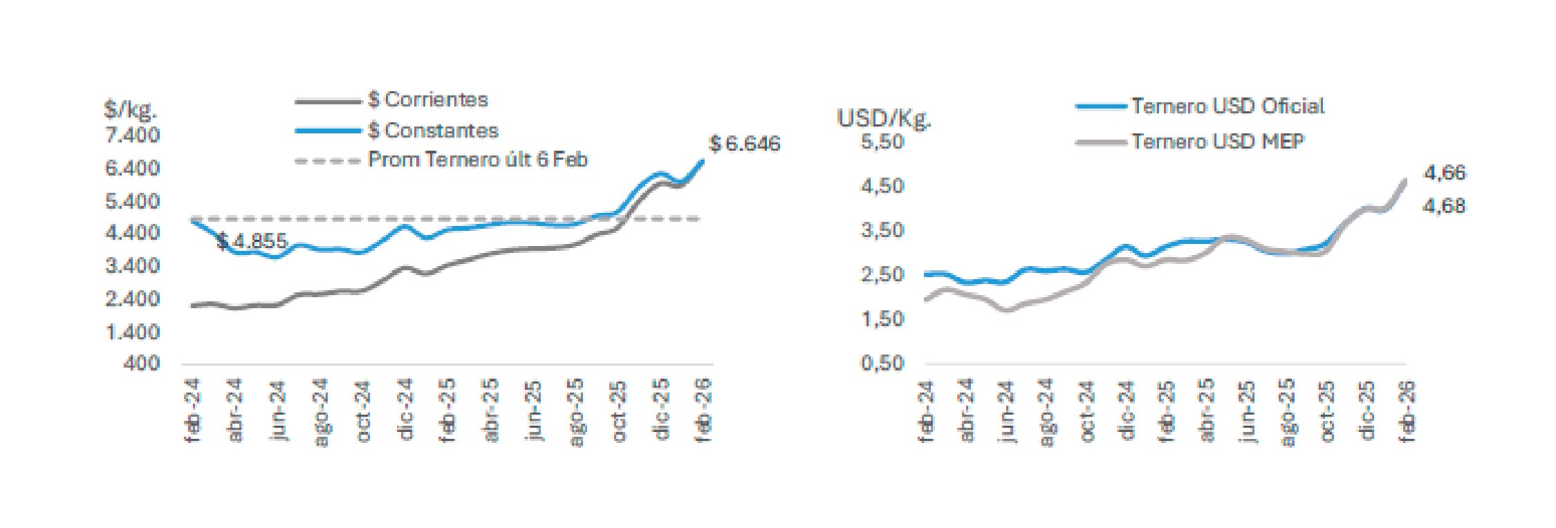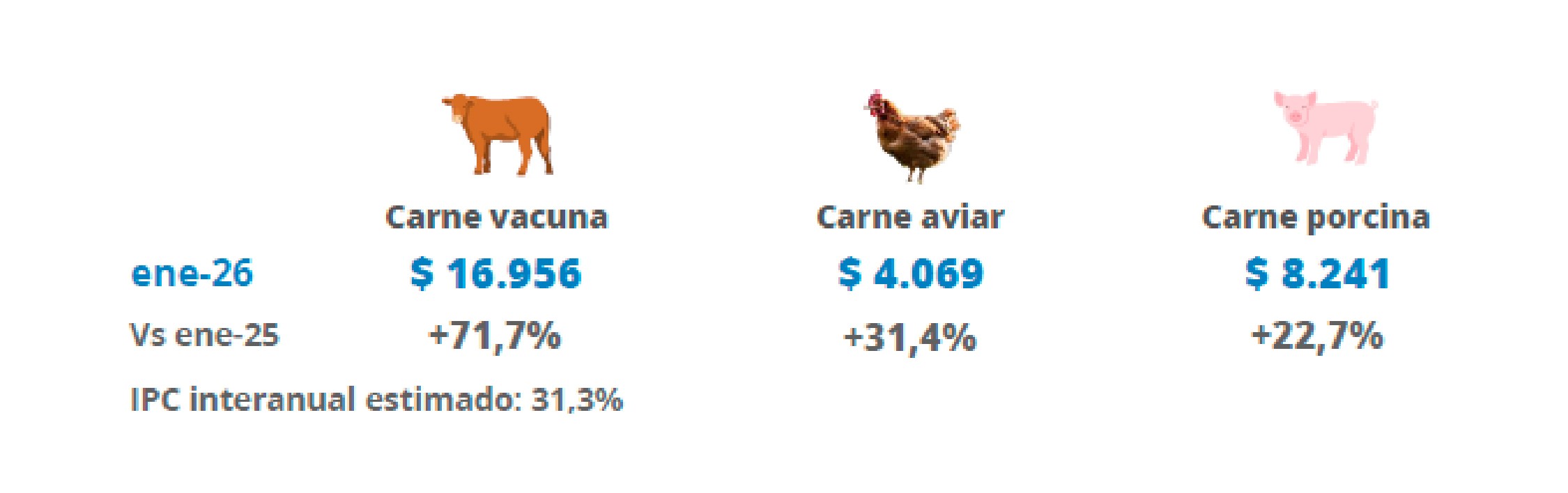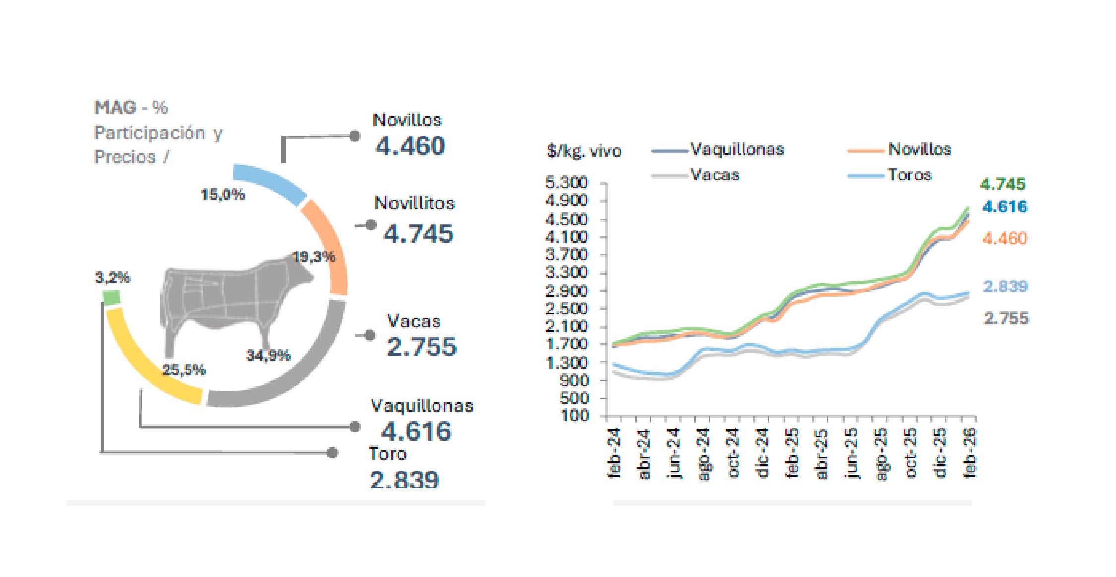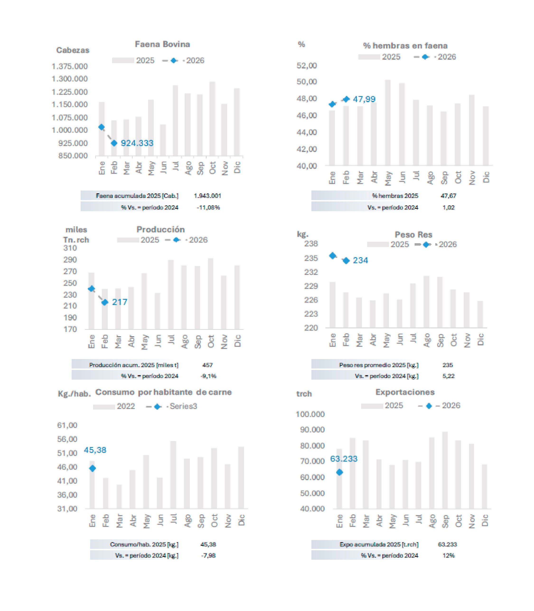 El MAG registró un nivel de ingresos de hacienda estable, en línea con el comportamiento habitual de la época del año. En cuanto a los precios, novillitos presentaron subas del 10% y vaquillonas entorno al 12%. Si bien los valores de la hacienda se mantienen firmes, el consumo muestra resistencia a convalidar mayores aumentos, lo que mantiene a la industria y matarifes operando con márgenes acotados. Las categorías livianas orientadas al mercado interno enfrentan un límite marcado por el poder de compra del consumidor, que hereda del 2025 subas en la carne vacuna del 70%, en tanto el salario se incrementó 40%. Los valores máximos de febrero parecen consolidarse como un techo sostenido sólo por recortes de oferta. Por otra parte, el novillo pesado creció un 8% en precio y complica los números de la exportación. Desde octubre, el novillo subió un 39%, la inflación acumuló un 13% y el dólar cayó un 3% frente al peso argentino.