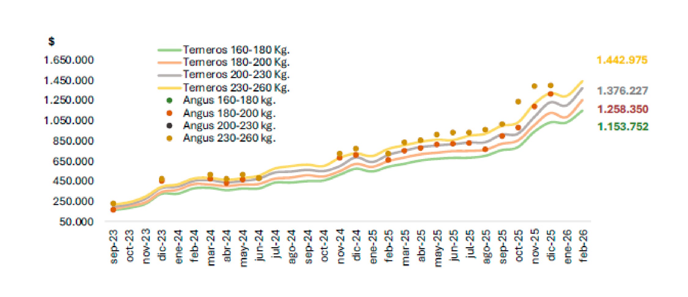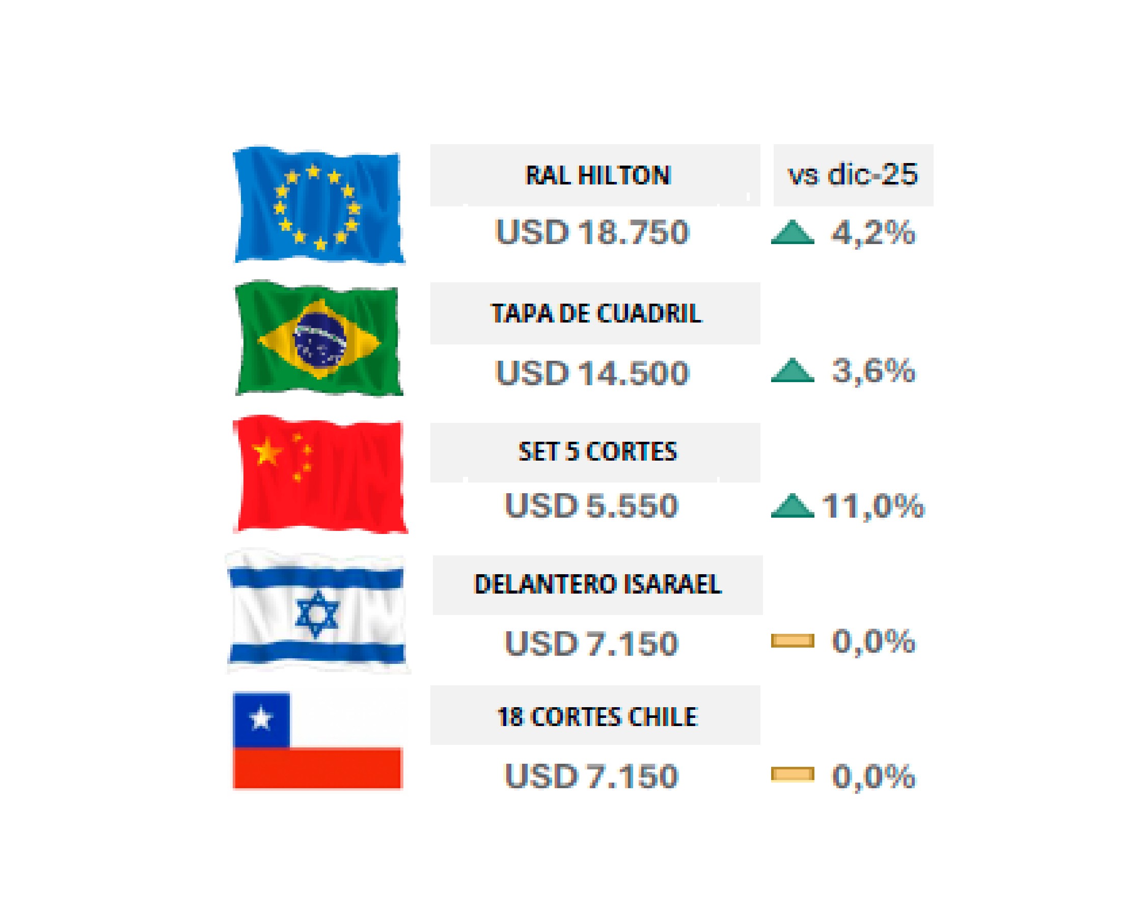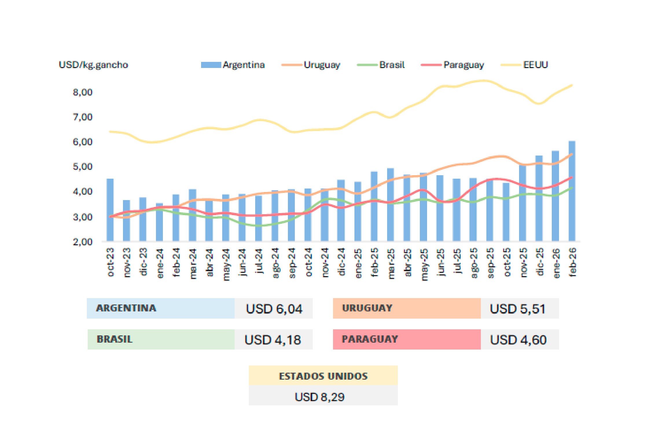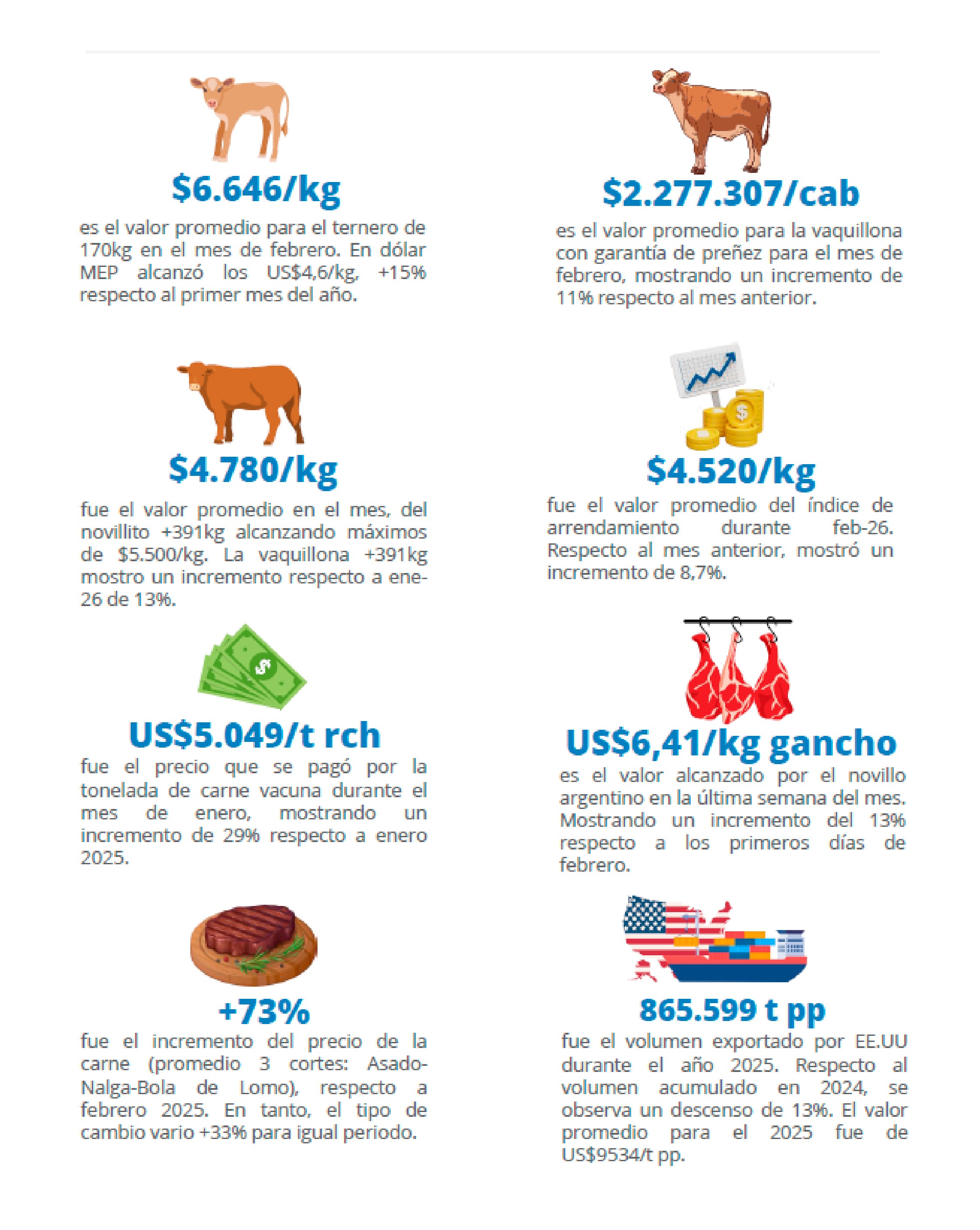 Ya se encuentra operativa la exportación hacia Estados Unidos de las 80mil toneladas peso producto otorgadas a nuestro país con arancel cero. En la práctica la oferta de cortes comercializados va más allá de los recortes de desposte (trimming), es amplia, lo cual potencia el atractivo exportador. En Argentina, el Senado aprobó el acuerdo MERCOSUR-Unión Europea, se estima que a partir de mayo la Cuota Hilton se comercializará con arancel cero (hoy 20%) y estarán disponibles 20 mil toneladas con arancel del 7,5% para los países que hayan aprobado el acuerdo. China comenzó el año con valores de compra en alza, +20% , si bien se prevé que este año caerán las importaciones (-165mil t. rch) y el consumo de carne vacuna (-5%), los valores se mantendrán firmes con un acotado volumen otorgado (2,7M 2026 t vs 3,3M t 2025) a los importadores chinos bajo arancel comercial competitivo del 12%.